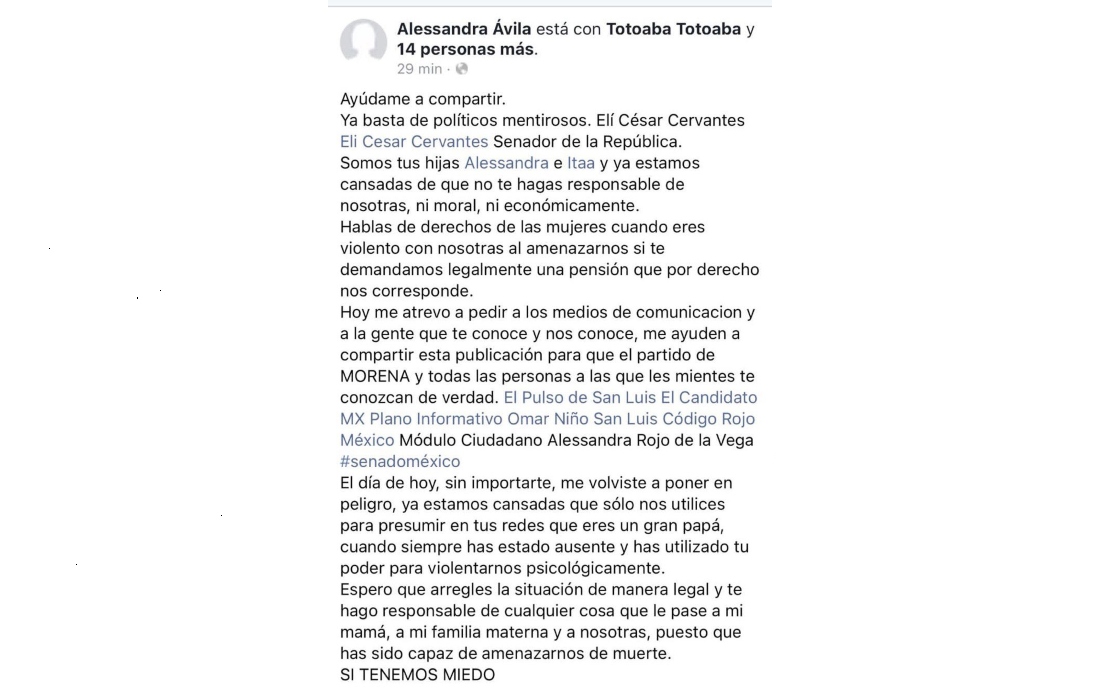 En redes sociales, Alessandra e Itaa, hijas del senador de la República por Morena, Eli César Cervantes Rojas, acusaron a su padre de irresponsable, al no darles la pensión alimenticia.